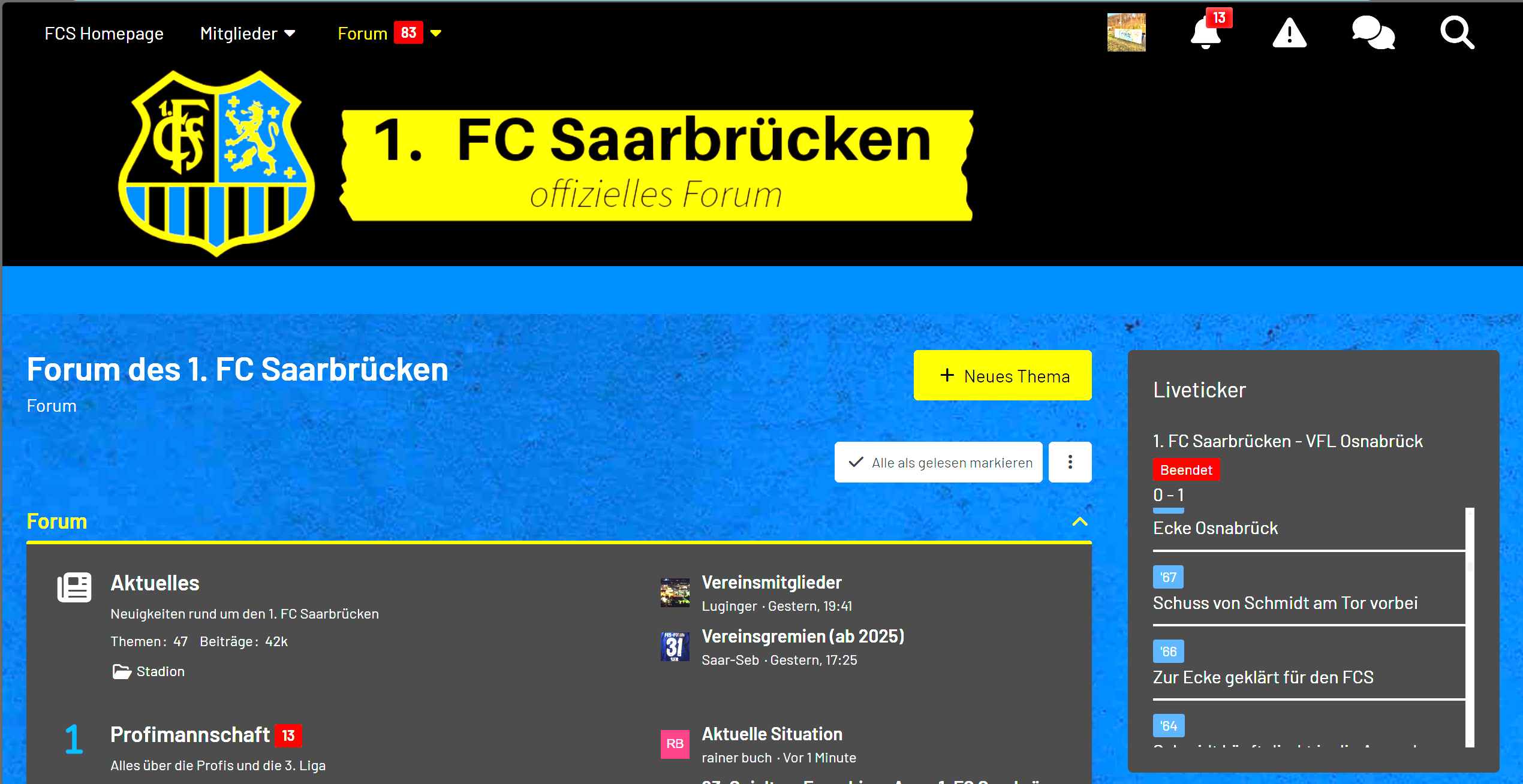 1. FC Saarbrücken, habe ich Anpassungen am Forum-Design vorgenommen und einen einfachen Liveticker, der durch die Foren-Admins geführt wird, implementiert